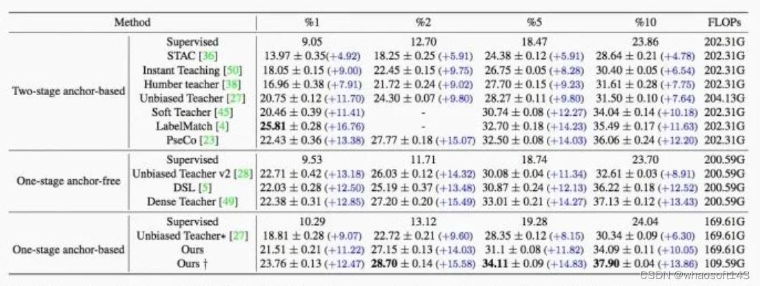 同时,我们还仔细研读了CVPR2022的一系列半监督目标检测工作,其中两篇关键论文加速了我们的研究进度,一篇是来自阿里达摩院的《Dense Learning based Semi-Supervised Object Detection》,一篇是来自海康研究院的《Label Matching Semi-Supervised Object Detection》。这两篇论文不仅有扎实的理论阐述,还提供了优雅、可读性高的代码实现。根据这两篇论文的思路和超参说明,我们第一次在实验中让YOLOv5的COCO半监督实验指标开始提升。