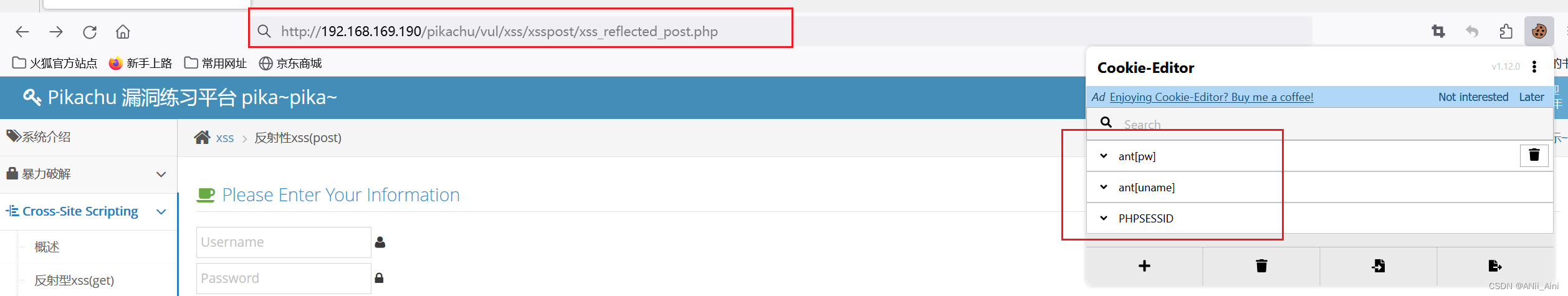 网址是这个http://192.168.169.190/pikachu/vul/xss/xsspost/xss_reflected_post.php